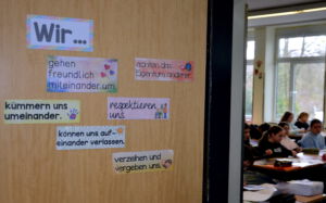 Die Fünfer-Kinder wissen, wo’s langgeht. Ihre Kurzformel: „Keine Schimpförter, nicht lästern oder auslachen und die Türen aufhalten.“ Im gesamten Schulgebäude hängen Plakate, die daran erinnern, dass Pünktlichkeit und ein sauberer Tisch keine Hexerei sind. Ebenso wenig wie sorgsamer Umgang mit Ressourcen: „Umwelt achten“. Viele Klassen können sich noch an die „Sauberzauber“-Aktion erinnern, deren Müllberge manche sprachlos machte.