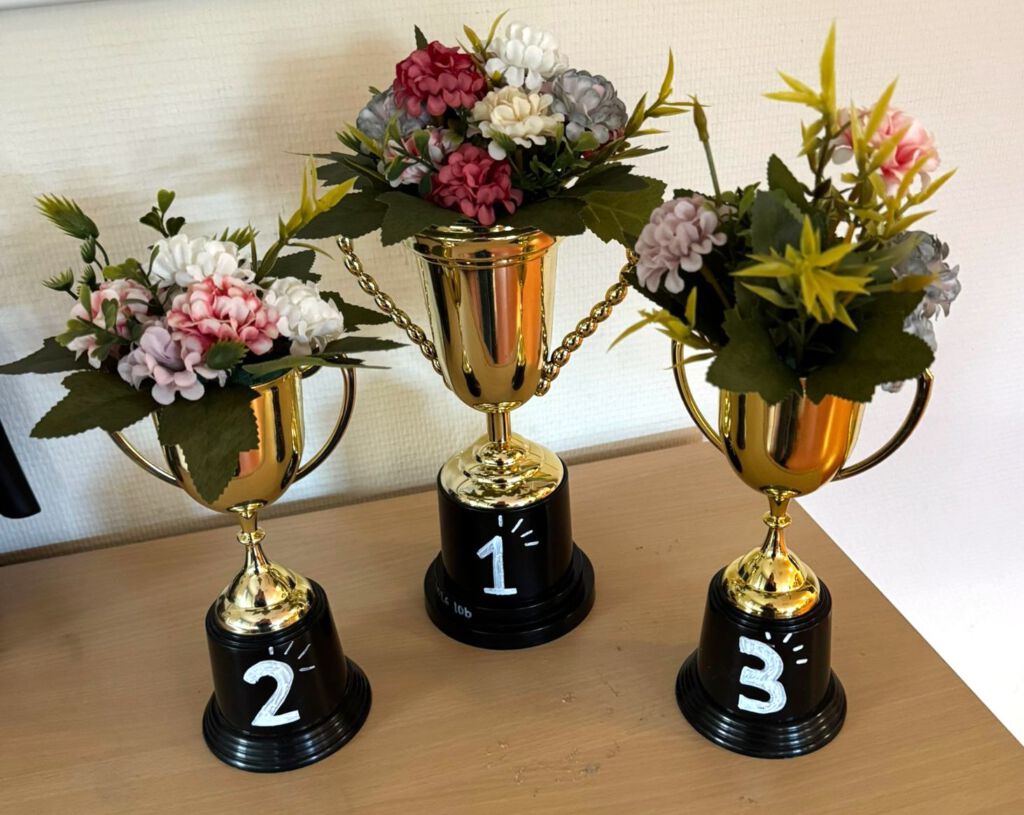 Eine Zierde für den Klassenraum: die 10b (1. Platz), die 10a (2.) und die 9b (3.) haben sich ihre Pokale redlich verdient.